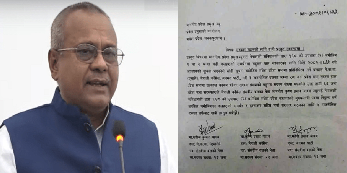 प्रदेश प्रमुखको कार्यालय, जनकपुरधाममा बुझाइएको उक्त पत्रमा नेपालको संविधानको धारा १६८ को उपधारा (२) बमोजिम दुई वा दुईभन्दा बढी दलको समर्थनमा बहुमत प्राप्त सरकार गठन गर्न प्रदेश प्रमुखले आव्हान गरेको सूचना अनुसार दाबी गरिएको उल्लेख छ ।