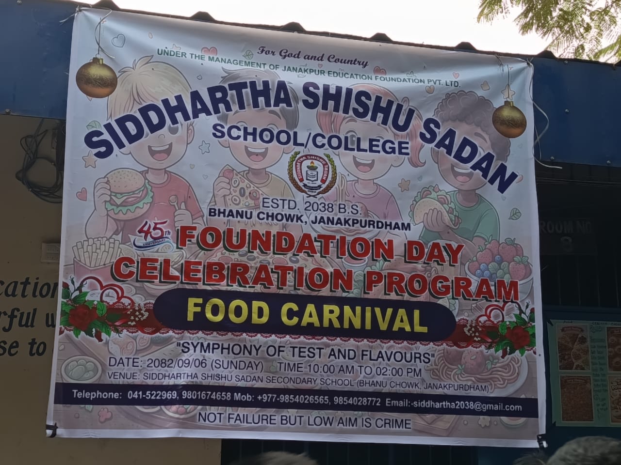 जनकपुरधाम, पुष ६ गते । नेपालको शिक्षा जगतमा छुट्टै पहिचान स्थापित गर्न सफल जनकपुरधामस्थित सिद्धार्थ शिशु सदनले आफ्नो ४५ औँ वार्षिकोत्सव भव्य रूपमा मनाउँदै छ। विद्यालयले २०८२ साल पौष ५ गते शनिबारदेखि तीन दिनसम्म विविध शैक्षिक, सामाजिक तथा मानवीय कार्यक्रमहरूको आयोजना गरी वार्षिकोत्सव मनाउन लागेको हो।